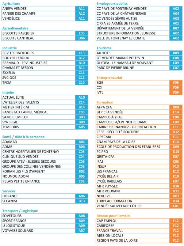 - 73 exposants : entreprises privées/publiques de tous secteurs d’activité, organismes de formation, agences d’intérim, partenaires de l’emploi et de l’entrepreneuriat